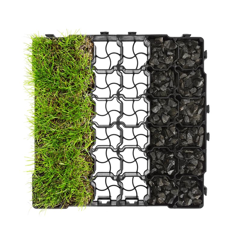 geoSYSTEM GP40 je nejnovější a nejuniverzálnější typ zatravňovací dlažby v naší nabídce. Nabízí nejlepší poměr ceny a užitné hodnoty. Díky kompaktnějším rozměrům (38×38 cm) a menším okům, má velmi vysokou únosnost, přitom je lehká a snadno se s ní pracuje. Tato dlažba má také nový, vylepšený systém zámků (snadněji zapadají do sebe a přitom vytváří ještě pevnější spojení).